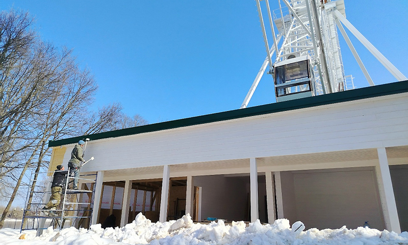 На противоположной стороне уже завершено возведение аркадного комплекса, где сейчас проводятся покрасочные работы фасада. К наступлению летнего периода внутри этих помещений будут установлены аттракционы, включая развлечения с использованием VR-очков, а также тир.
